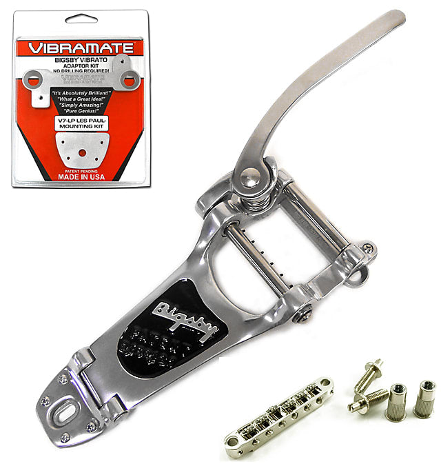 Using the Vibramate V7 enables you to easily and without holes or modifications (except a minor one to the B7 for lefty B7's) bolt the Bigsby B7 to your Gibson stop tail, archtop guitar. Fit's most Gibson and Epiphone Les Paul Archtop guitars.