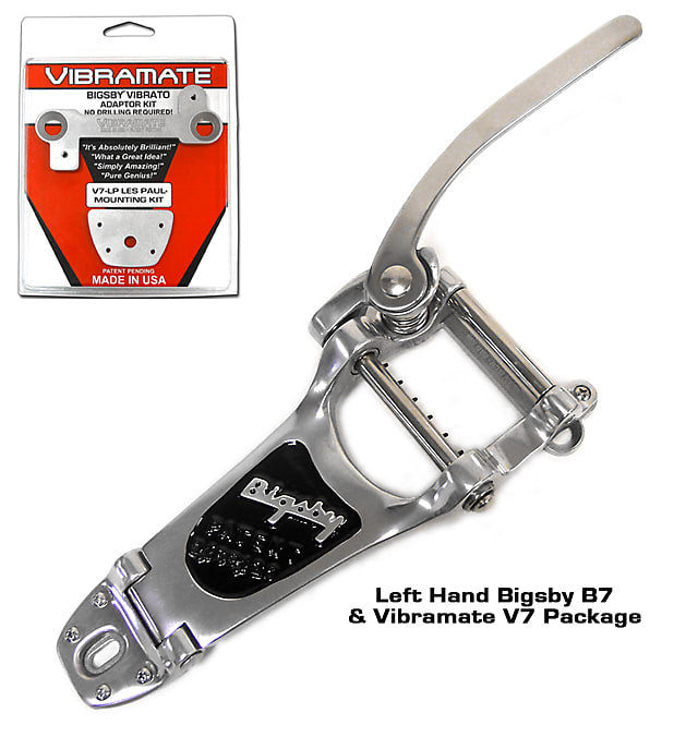 Pre-modded here before shipping - Bigsby B7 Left Handed & the Vibramate standard V7 are in this listing. Designed for Left Handed Gibson, other USA guitars with Gibson type specs, Epiphone and Import Les Paul solid body